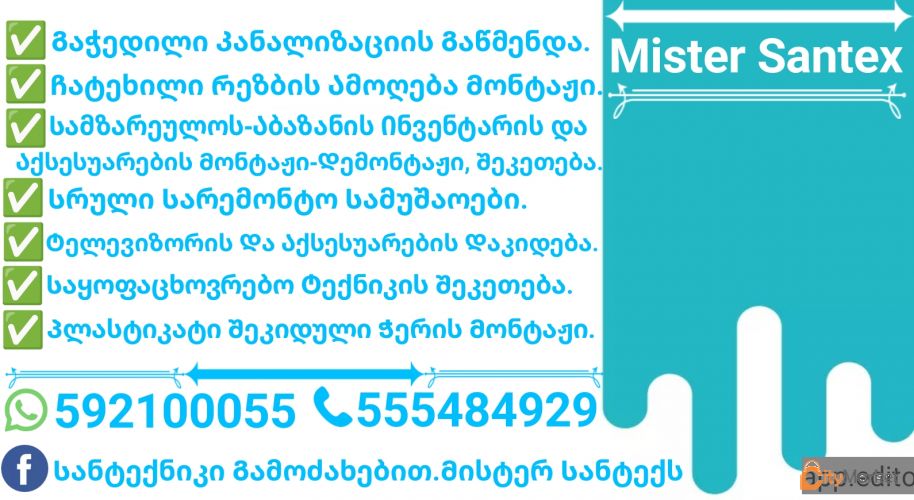 Კანალიზაციის გაწმენდა ელექტრო ტროსით და მაღალი წნევით სანტექნიკის გამოძახება მომსახურება ჩატეხილი რეზბის ამოღება 592100055 გამოძახება ფასიანია 30 ლარი. Მისტერ სანტექსი თქვენი ოჯახის მეგობარია
