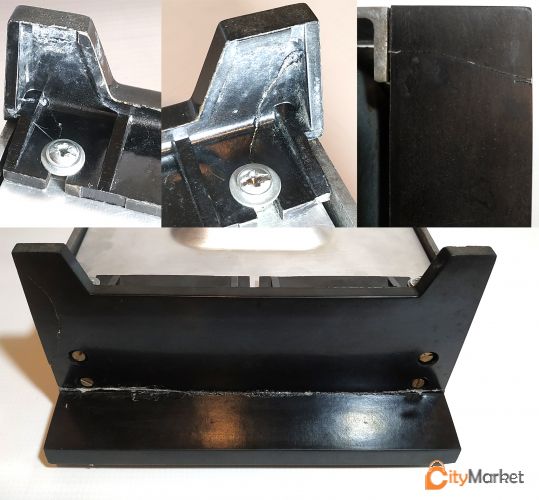 левая пластиковая сторона сломана и приклеена. все части точно подходят друг другу. недостающих осколков нет. Есть возможность заного склеить детали с помощью профессиналного клея.